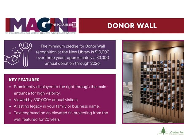 Be part of something extraordinary! Honor your family, business, or loved ones by securing a naming opportunity in Cedar Park’s new library. Whether it’s a place on the Donor Wall or naming rights to a prime library space, your contribution creates a lasting legacy of literacy, learning, and community.